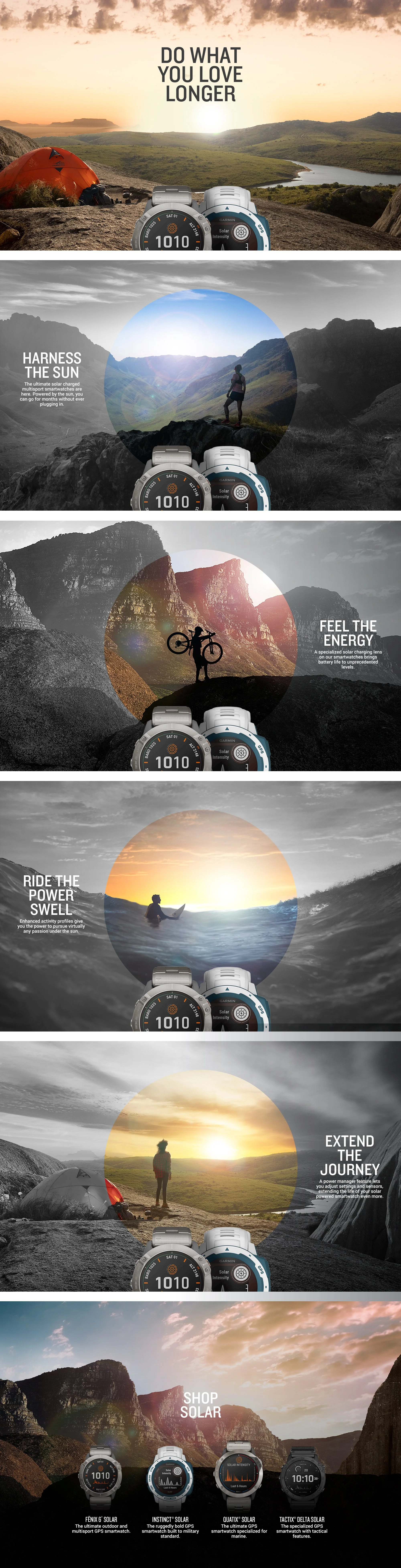 Batteries don’t just stop working. They die. And that’s a really depressing thought, especially when you’re in the middle of pursuing your passion in life. So here’s to staying alive, and the solar powered smartwatches that make it possible. Garmin was first to market with photovoltaic lens technology. We created this campaign to celebrate the upbeat and meaningful benefit of that technology advancement.