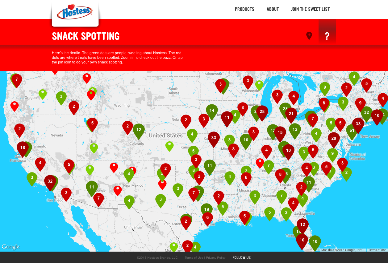 On the web, we created a Snack Spotting app for hungry consumers. Utilizing the Google Maps API, the interactive experience let users “spot” where they had seen Hostess products. The heat map also featured geo-located tweets, to show the Hostess-related buzz all across the country.